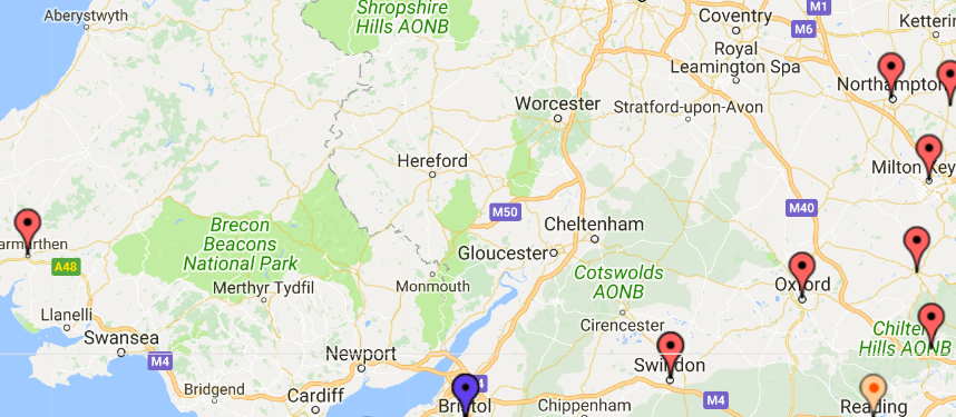 easily reached by road network might be either Somerset/Avon/Wales