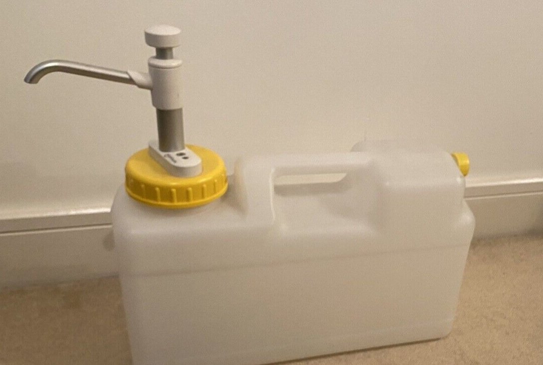 I found the rear screw cap on the 12L Reimo water container is the same screw fitting as hozelock, so I put a hozelock fitting on the other end from the whale pump. I can refill the Reimo water container inside from the 40L one outside the camper without carting water up the steps. The Reimo container has a Whale hand pump tap. I can't claim for that idea, I bought the Reimo water container with Whale tap already fitted off Ebay.