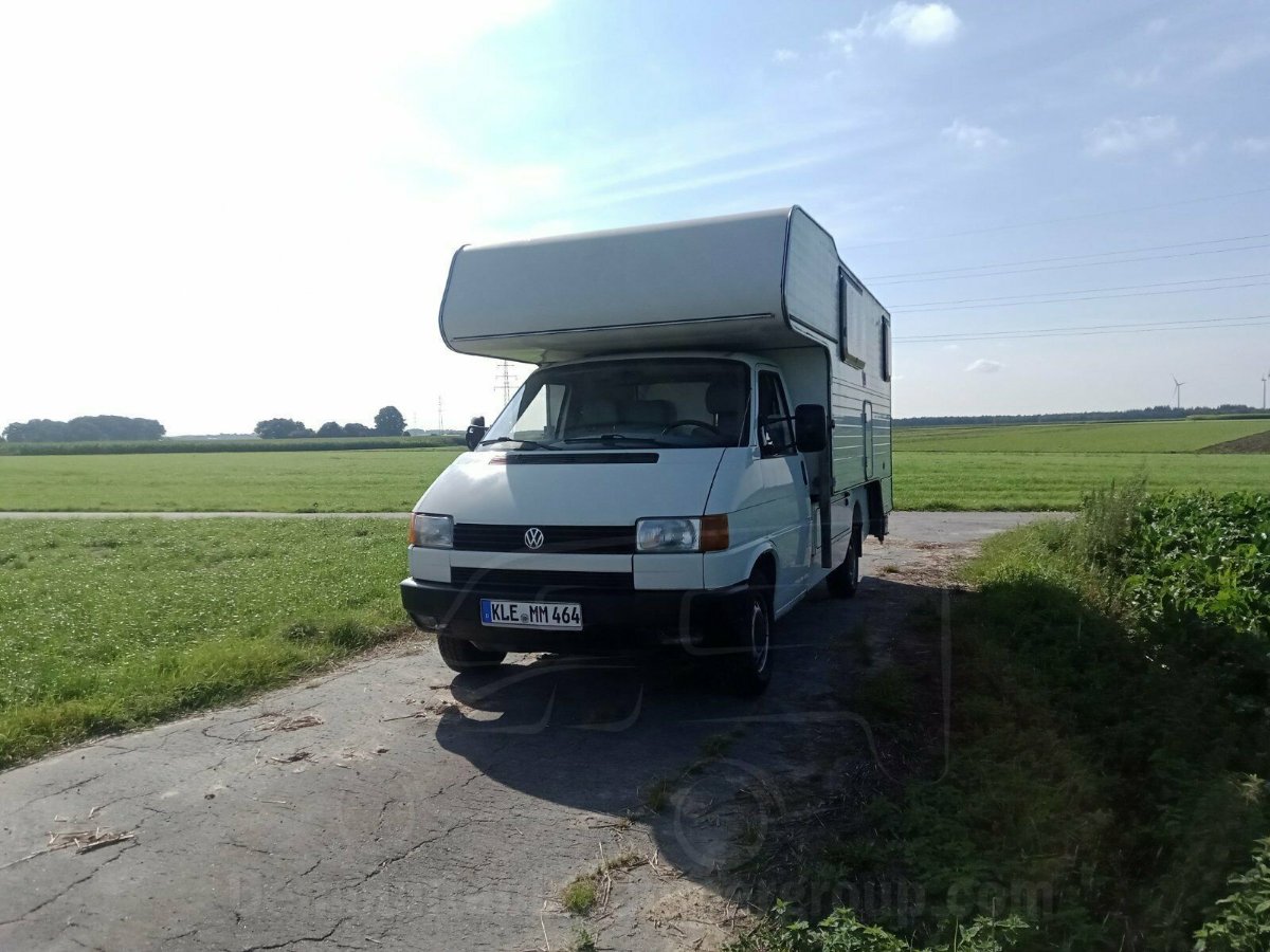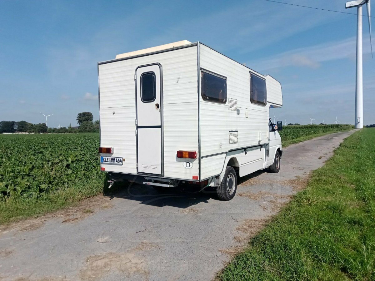 [translation]'Only a few rust spots need to be treated on the T4. Otherwise the condition is very good. The vehicle is technically flawless. The cabin needs attention and has to be repaired at the front right due to water damage on the lifting roof. The interior is undamaged and the devices are complete and functional'