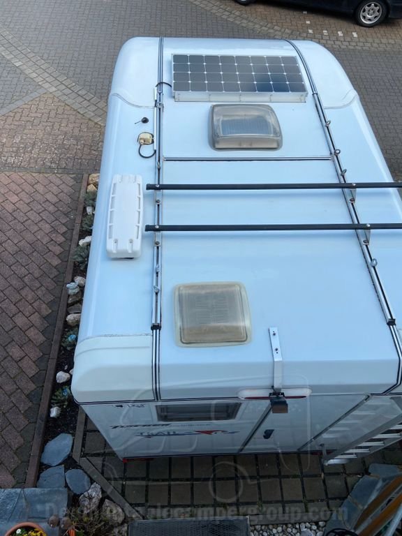 A two-part rear entrance door, a 40×40 skylight with mosquito net and blackout, a rectangular porthole on the rear wall of the roof,