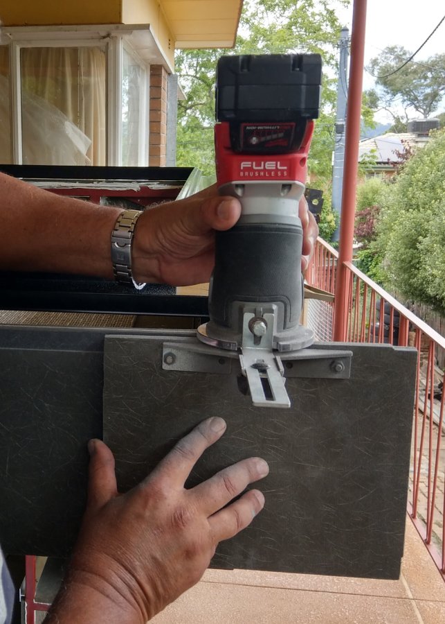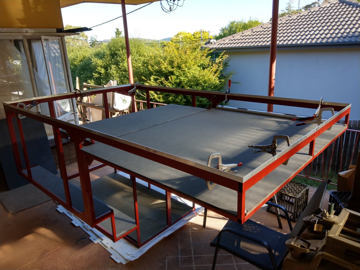 We sized and cut panels in a straightforward way with the Makita track saw and vacuum (some tracked cuts at 2.4m). The panels on the sides were comparitively easy to fit as we could use the clamps to hold the panel while it cured... one or two panels required different methods as there was less and less frame available to clamp up to. Got awkward. Large F clamps were purchased and used with lengths of RHS steel etc. We got there. Now I got to sell about 6 large F clamps...