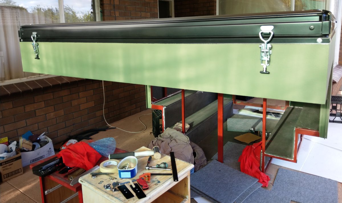 The whole poptop was a skill test I was never gonna be up to. Never done anything like this job. A proper tradesman may have done it in a week or less... WT had welded conveyors etc but never such intricate and detailed work such as this. WT just approached it methodically and really saved the day (that camper frame was not cut and welded by CNC!), being fastidious on every bit - got tiny caliper settings and cuts etc to get the 4 sides aligned exactly -exactly right- and this paid off in the later stages believe me. When it came together and shut the first time, even left to right and front to back I was so happy -hard to take it in after more than a month of niggles and setbacks on this poptop frame. Truly, the hardest part of the whole build. More later.
