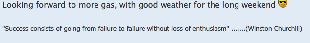 Looking forward to more gas, with good weather for the long weekend 8-)